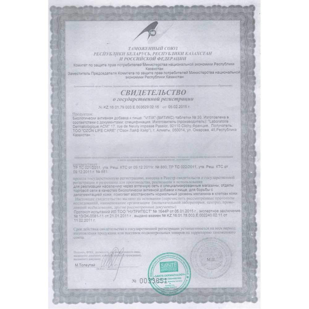 - Организация, принимающая претензии в РК: ТОО «SANTE DERMATOLOGY»